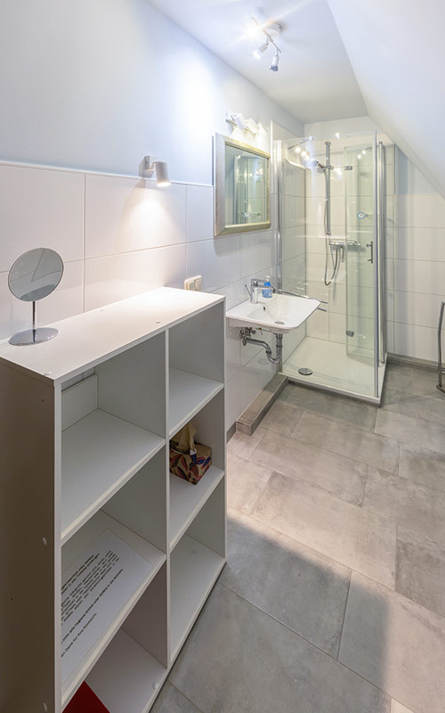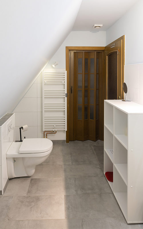 Dusche, WC, Waschbecken, Handtuchheizkörper, Abstellkammer