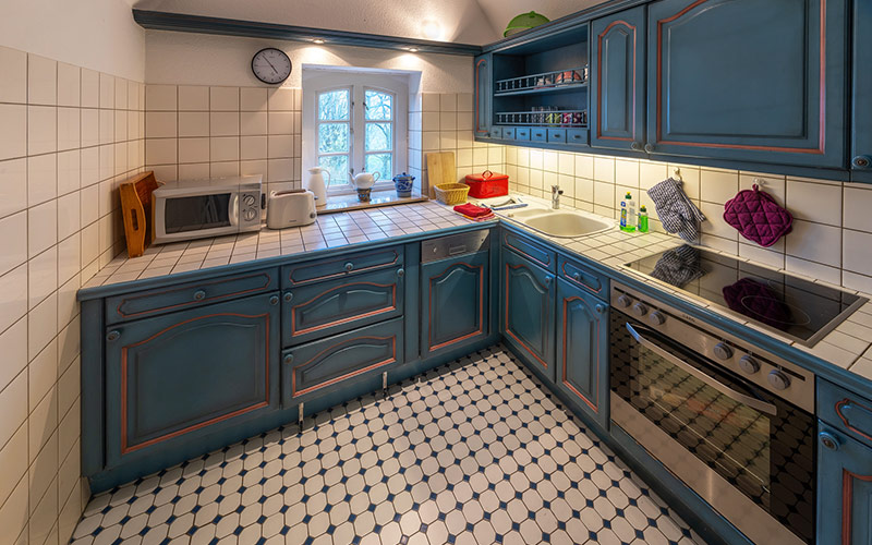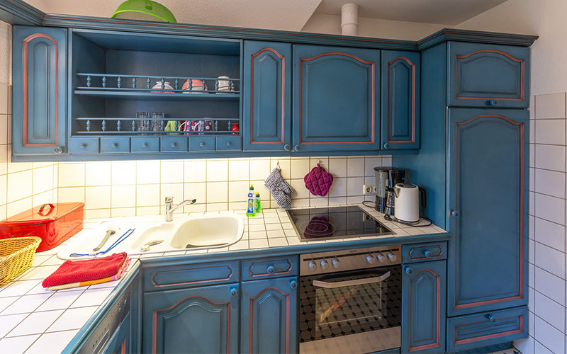Ceran-Elektroherd, Mikrowelle, Backofen, Kühlschrank mit Gefrierfach, Geschirrspüler, Toaster, Kaffeemaschine, Wasserkocher