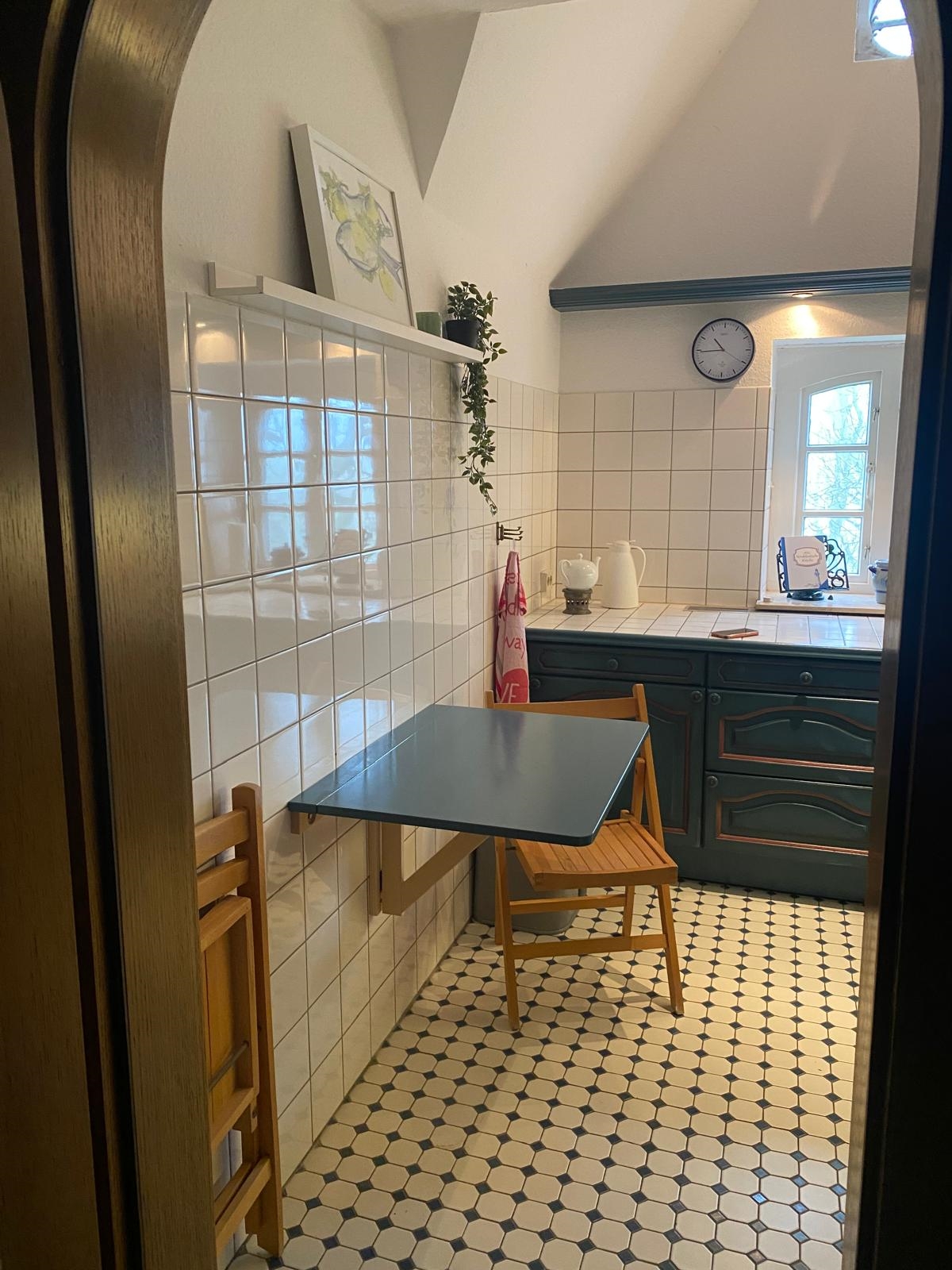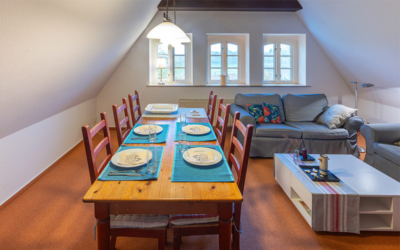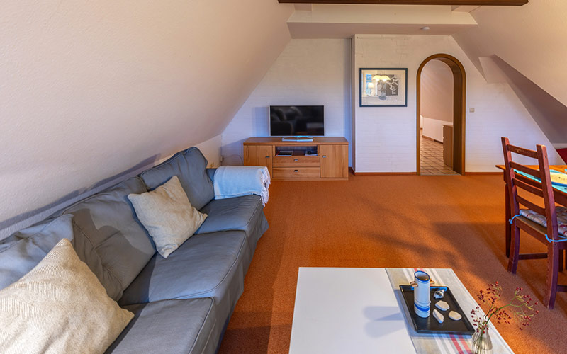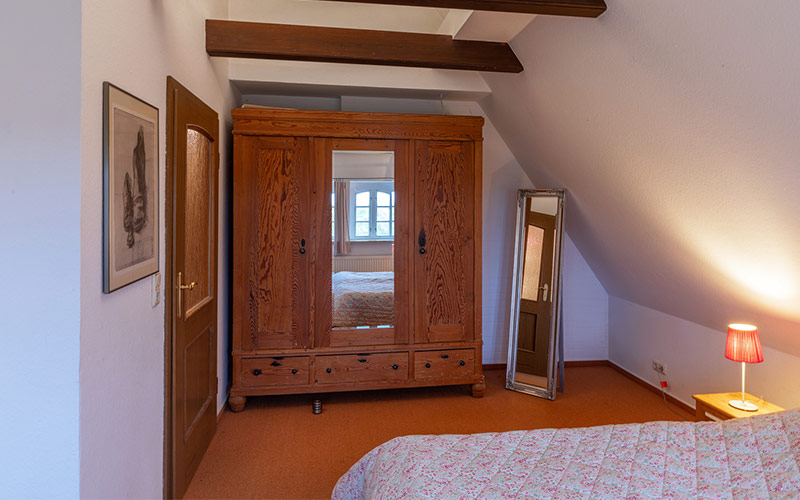 Die Ferienwohnung in der ersten Etage hat eine Größe von ca. 80 qm und verfügt über ein Ess-/Wohnzimmer (SAT-Farb-TV) mit einer Schlafnische, ein großes Schlafzimmer, eine vollausgestattete Küche sowie ein großzügiges Bad.